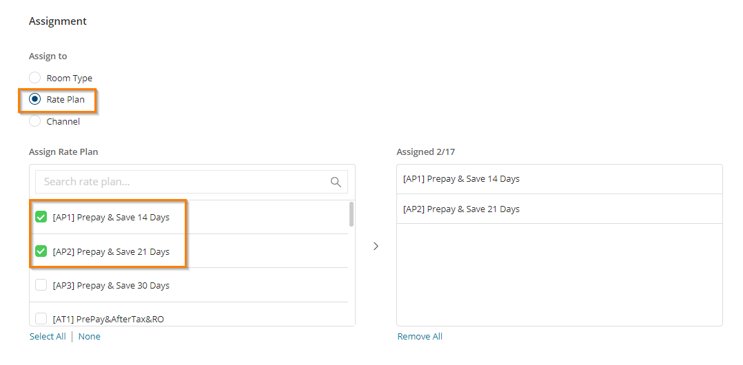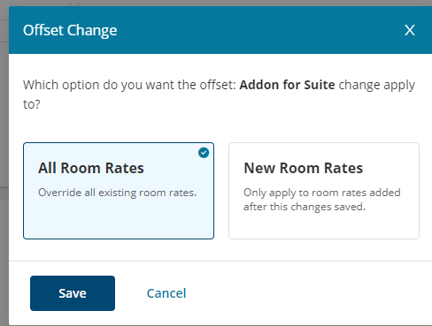 Please note that when you try to update the assignment list, you will see a pop up notification. Click 'All Room Rates' to override the changes to all impacted room rates, or click 'New Room Rates', if you want to keep the existing setting for existing room rates, but only to apply the changes to newly-added room rates in the future.