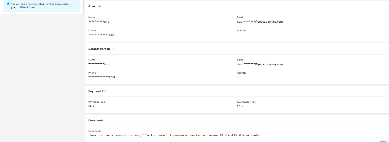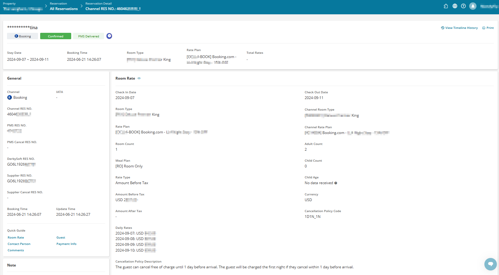 Reservation Detail displays all the essential reservation elements including General information, Room Rate, Guest information, etc.