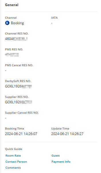 Channel RES No, PMS RES / Cancel RES No, DerbySoft / Supplier RES No, Booking / Update Time (Local Time)