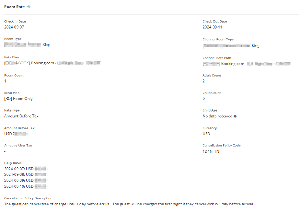 Display the essential information like Check in / out Date, Room Type, Rate Plan, Room Count, Meal Plan, Occupants, Rate Type, Amount before/after Tax, Currency, Daily Rates, Cancellation Policy Code and Description