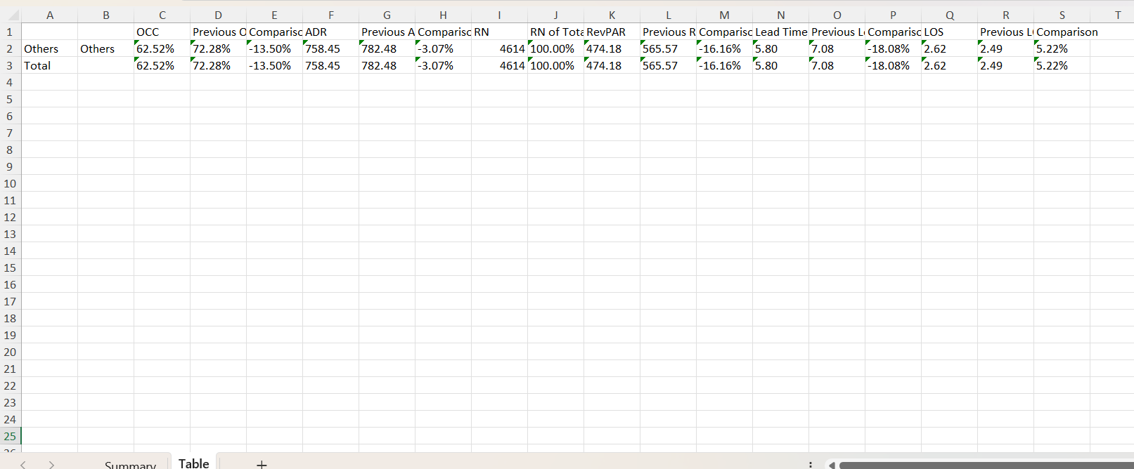 - Performance (Occupancy, ADR, RN Contribution, RevPAR, Average Lead Time, LOS)