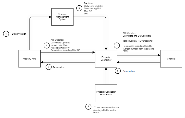 - IDeaS pushes decisions to the Property Connector,, including BAR Rate updates, Overbooking Unit for each room type, MinLOS or Hurdles.