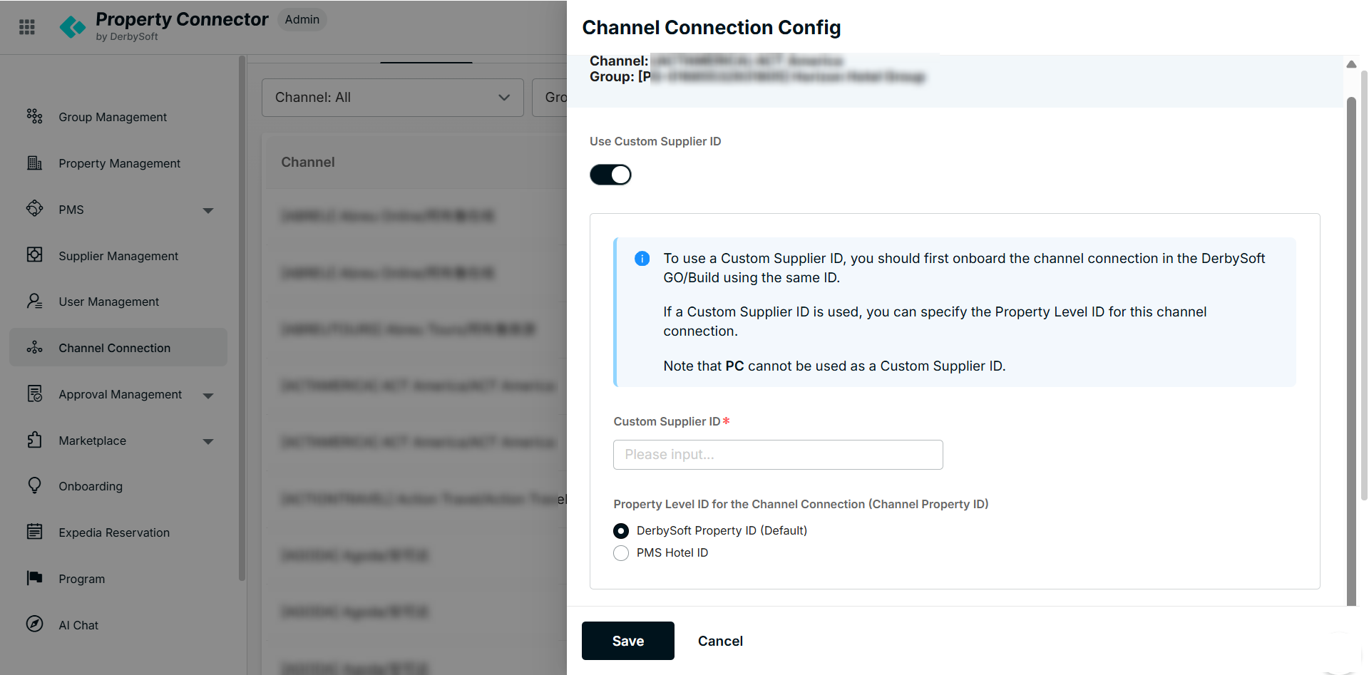 - When configuring channel connections for a group, users are allowed to use a custom supplier ID.