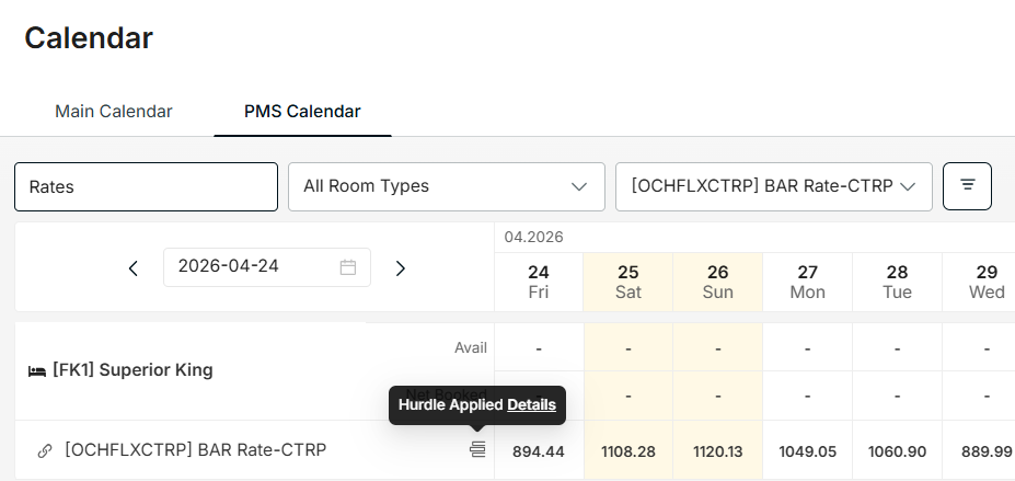 3.) PMS Calendar > Rates, an icon indicating that 'Hurdle Applied'